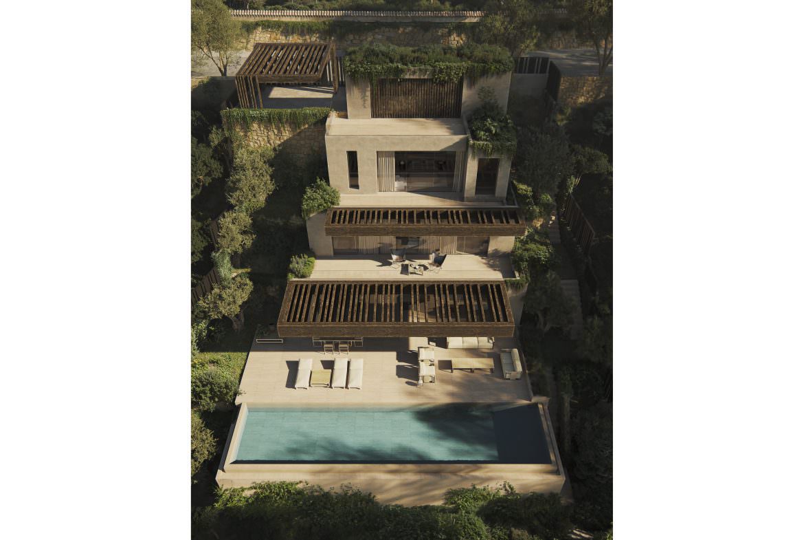 Designed across four cascading levels, the villa follows the natural slope of the terrain, integrating clean lines, noble materials, and large glazed openings that enhance light, privacy, and continuity between interior and exterior spaces.