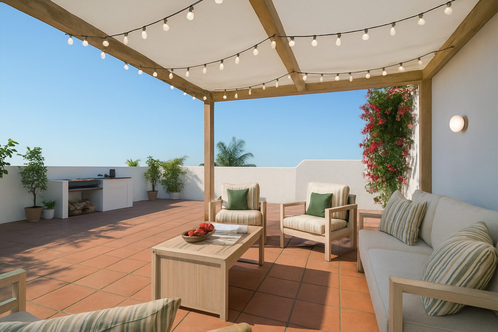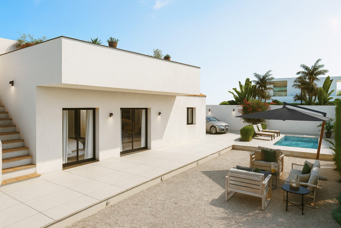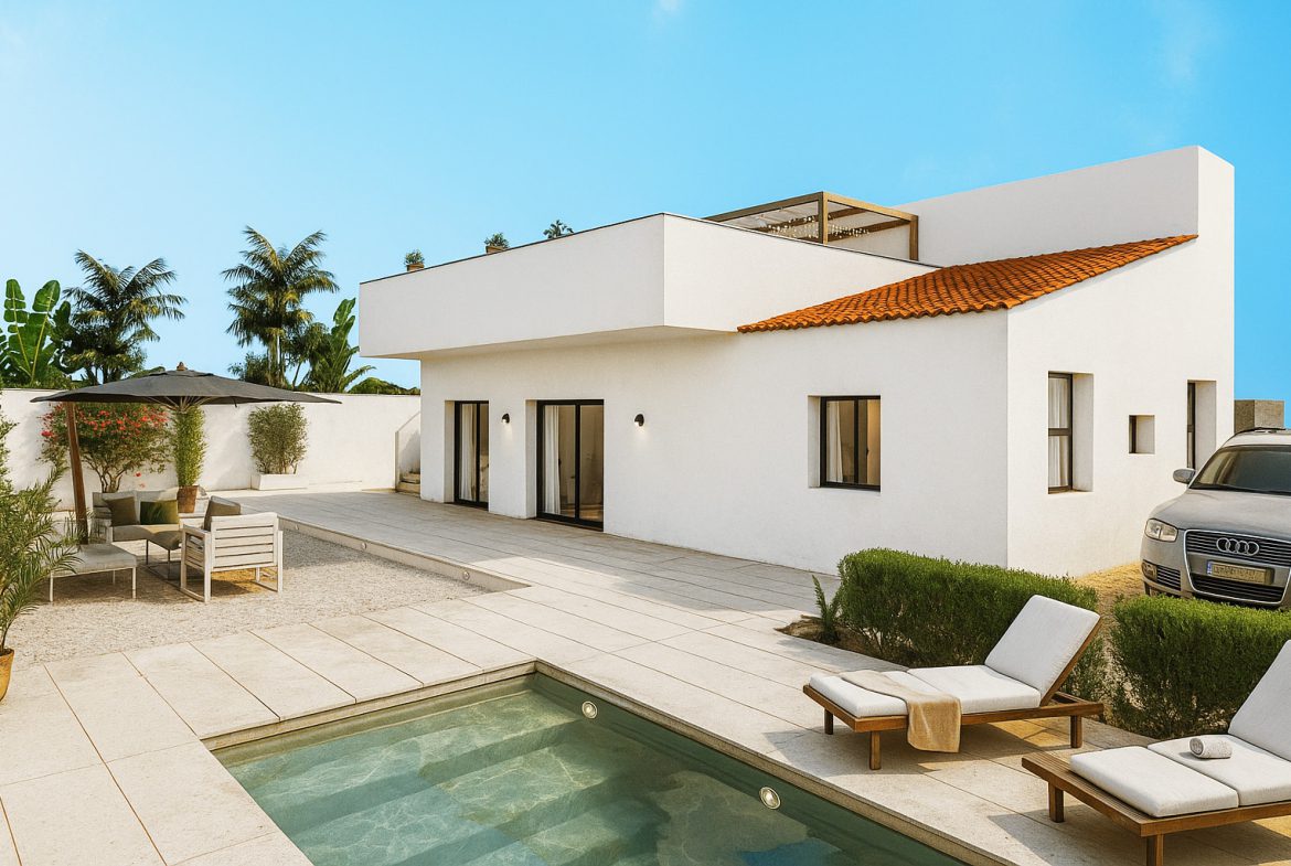 With a built area of 110 m² and a 60 m² solarium on a 400 m² plot, the property combines clean architectural lines and abundant natural light with unobstructed views of the mountains and the assurance that no new buildings will be constructed in front of the property. The area also has bars, a pharmacy and a health centre. Access is completely flat, from the street to the garden and swimming pool, providing practical and easy accessibility.