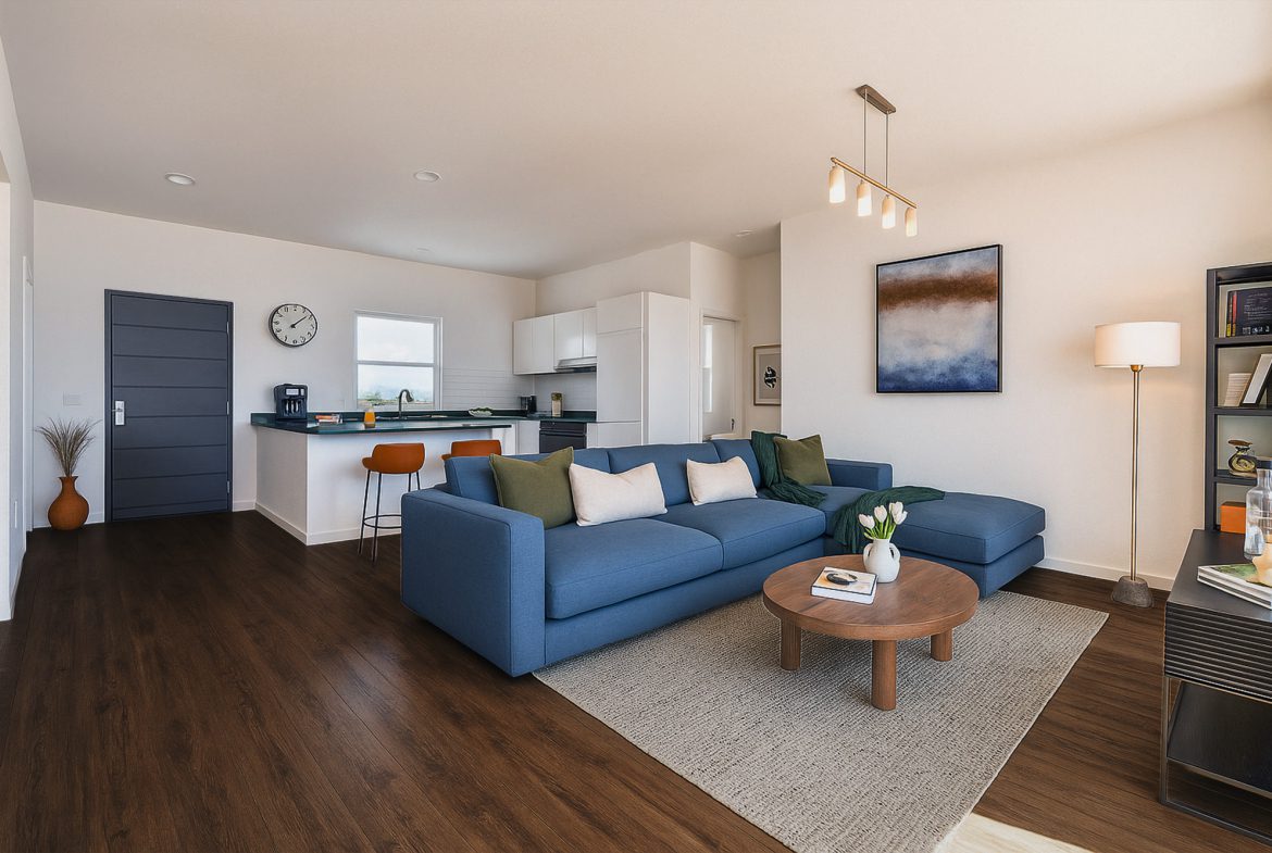 The floor plan is centred around the living-dining room with integrated kitchen, which serves as the central hub of the home. From here you have access to the three bedrooms: two of them share a full bathroom, while the master bedroom has its own bathroom and wardrobe.